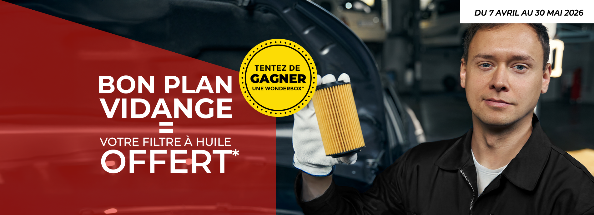 *Offre valable du 7 avril au 30 mai 2026, uniquement pour une prestation de vidange comprenant 5 litres d’huile minimum et un filtre à huile. Filtre à huile offert dans la limite de 20€TTC, le dépassement de ce montant sera facturé. Opération valable chez votre réparateur Precisium Garage participant. Voir la liste des garages participants ici.